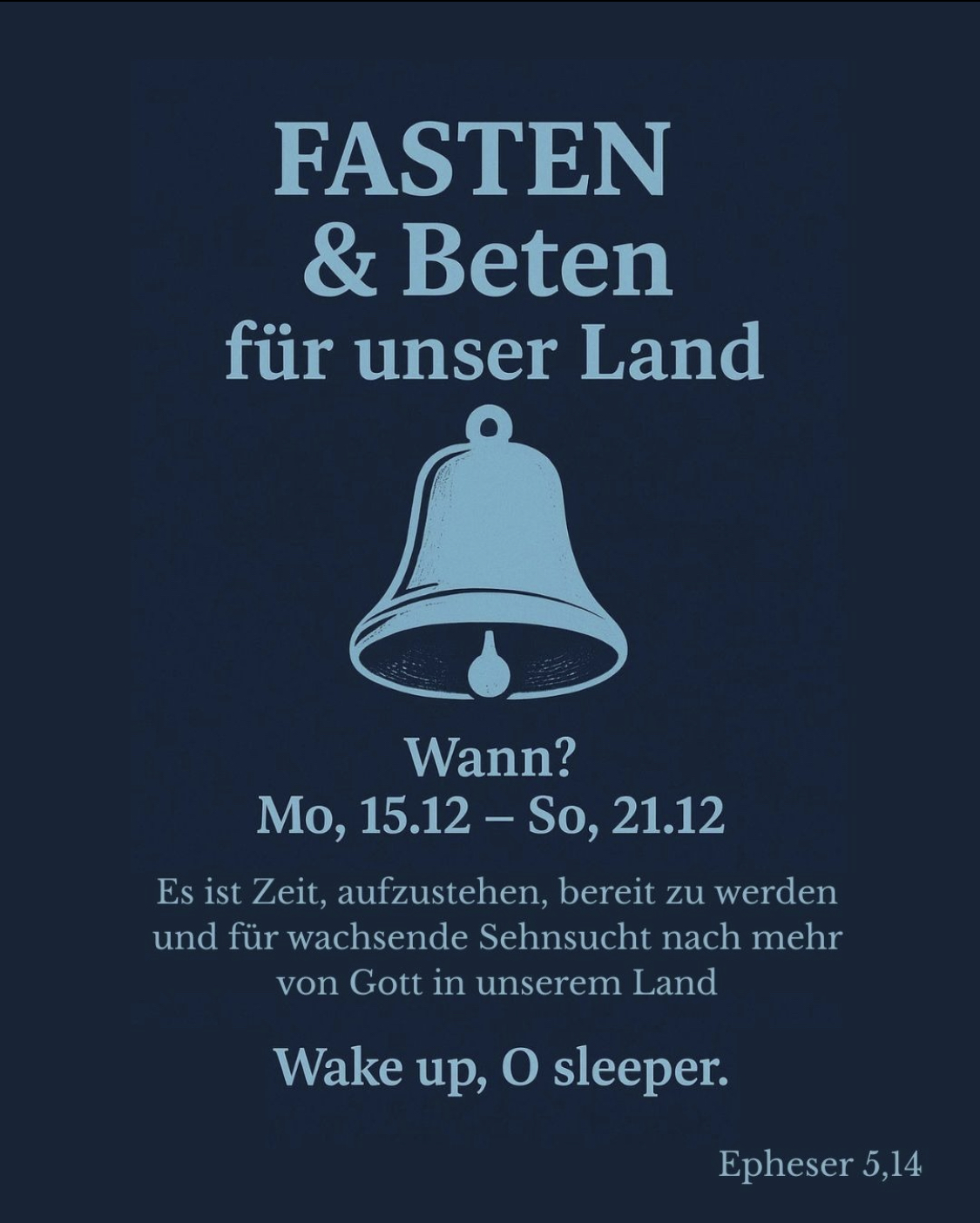 Auszug von deren Homepage: Wir rufen dazu auf in der Woche zwischen dem 3. und 4. Advent gemeinsam mit euren Netzwerken für unser Land zu beten und zu fasten. In welcher Form ihr das tut ist jedem persönlich überlassen.